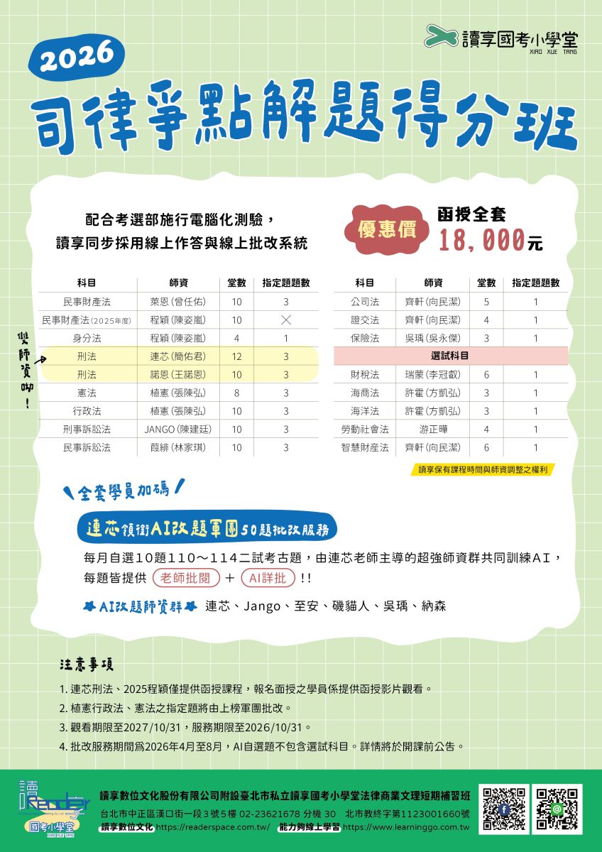 2026年4月至8月,每月自選10題110~114年度司律二試考古題(科目不限,可重覆題目)練習,由連芯老師主導、讀享名師們共同訓練的AI批改服務。每題將可以獲得「老師批閱」+「AI詳細批閱與建議」兩項回饋!!!